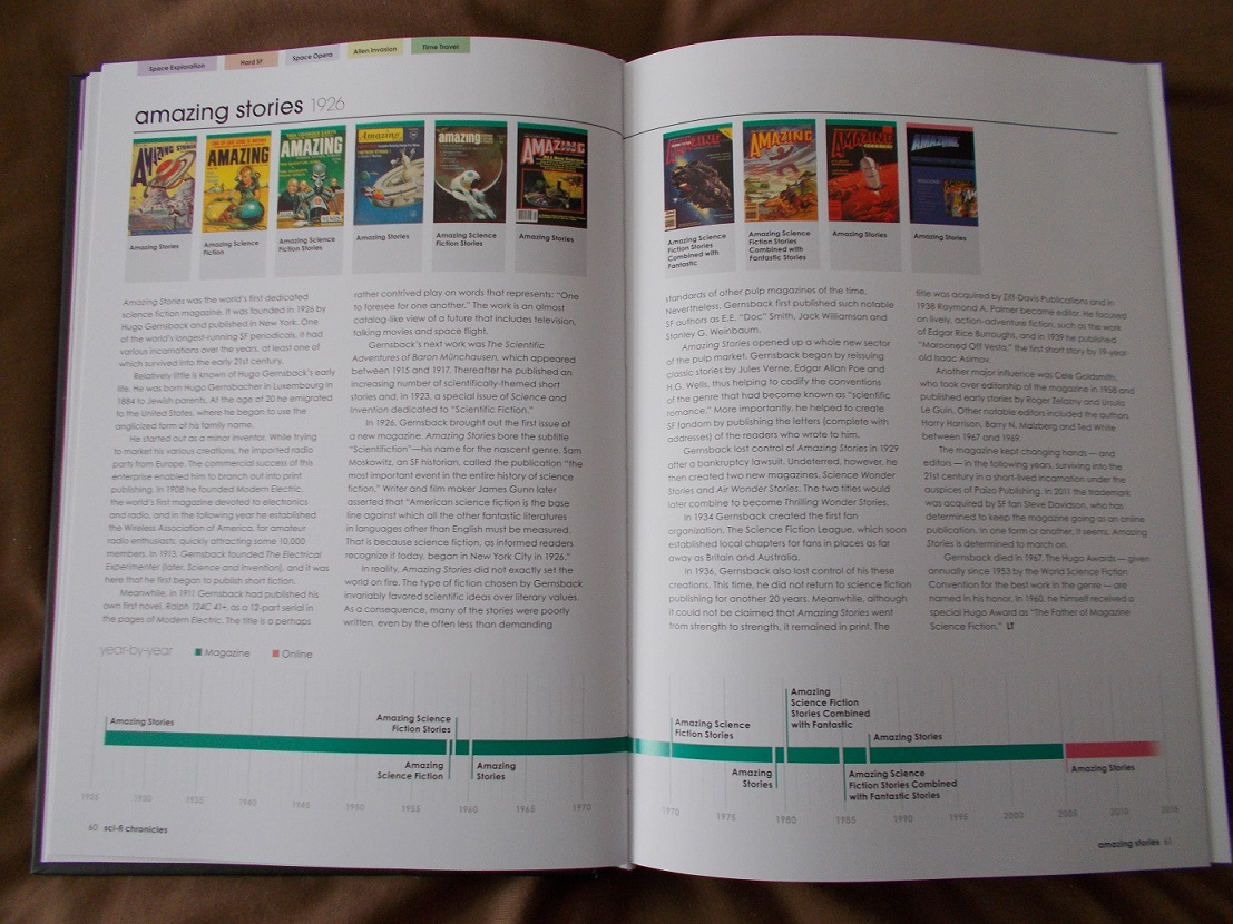 So far, so good. The layout of the actual chapters is generally in single or double pages, with images across the top of the page, text in the middle and a timeline at the bottom showing the context of the item being discussed. There is a keyword referencing system usually in the top left corner of the page, referencing themes such as ‘Space Opera’, ‘SF Horror’, ‘Steampunk’, ‘Post-Apocalyptic Fiction’, ‘Hard SF’ and ‘Time Travel’. Each chapter has its own contents page too, and there’s a reasonably comprehensive Index at the back.