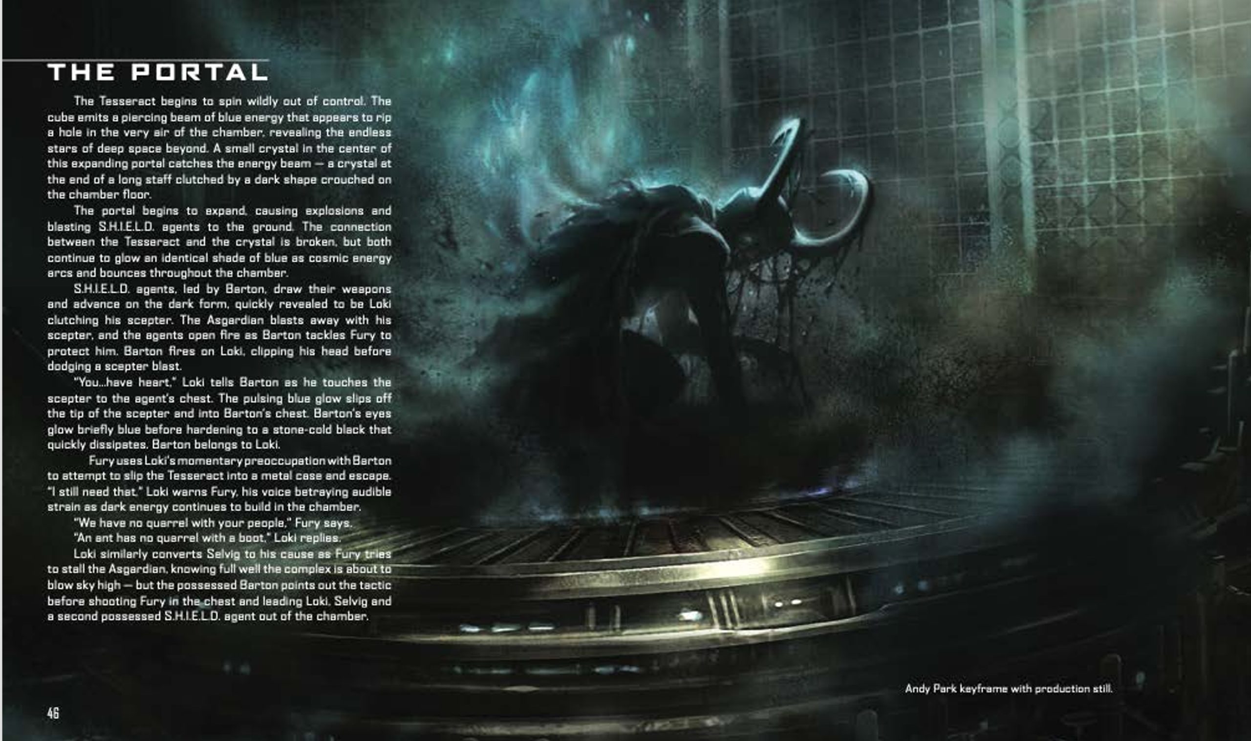 In the middle part of the book, the chapters are divided into three Acts. In the first, Incident in the Desert, we have the discovery of the Tesseract and so too details of costumes, weaponry and settings involving Nick Fury, Phil Coulson (played by Gregg Clark) and the Agents of SHIELD.